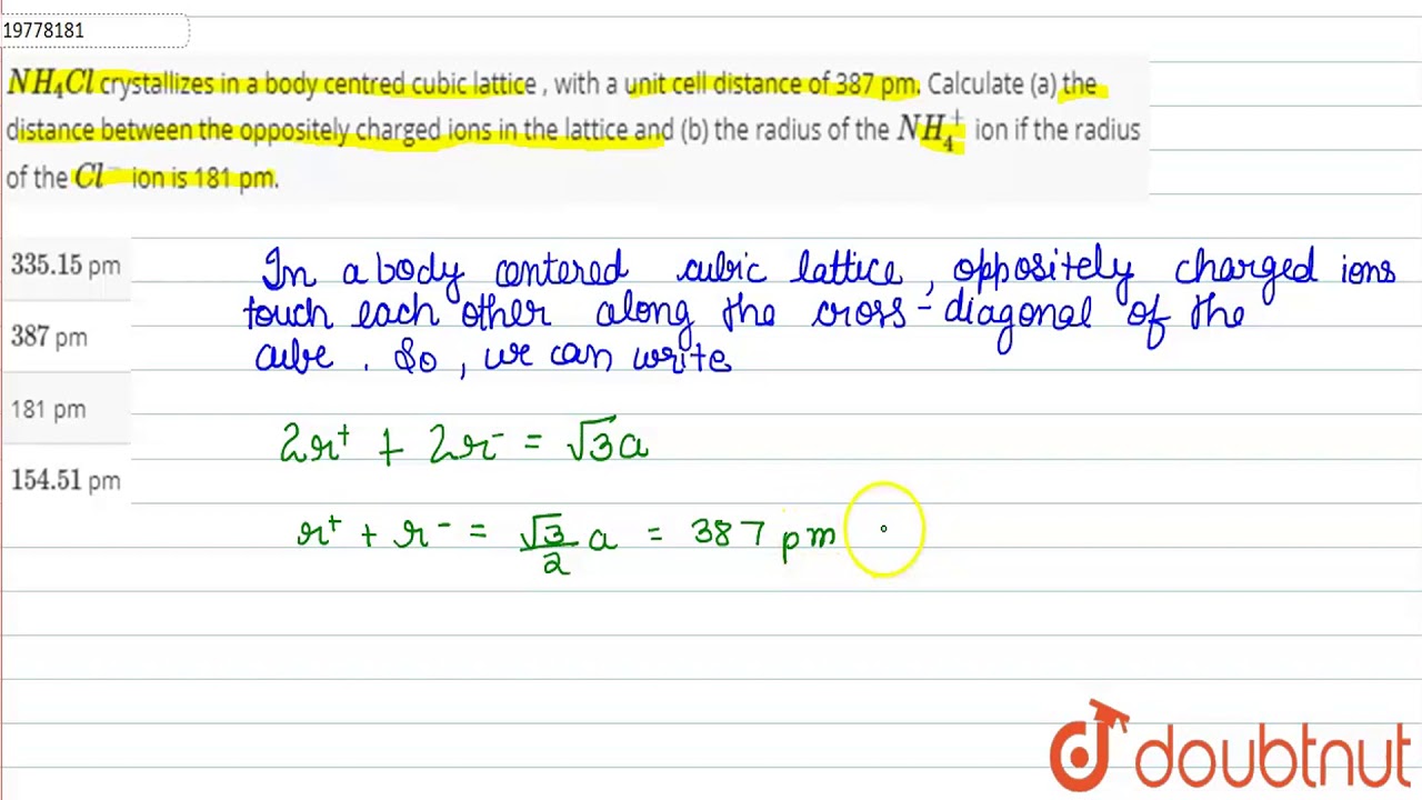 Nh 4 Cl Crystallizes In A Body Centred Cubic Lattice With A Unit Cell Distance Of 387 Pm Youtube